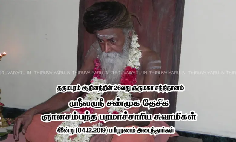 On 4th December 2019, Srilasri Shanmuga Desiga GnanaSambantha Paramachariya Swamigal passed away due to health problems. He is the 26th GuruMaha Sannithanam (Chief) of one of the most famous Saivite Mutt called Dharmapuram Adheenam which is located at Dharmapuram Village of Mayiladuthurai in Nagappatinam District. For the past few days he was admitted in a private hospital at Thanjavur due to some illness. Due to his failure in response to the treatment given by the hospital, he passed away in his age of 93.