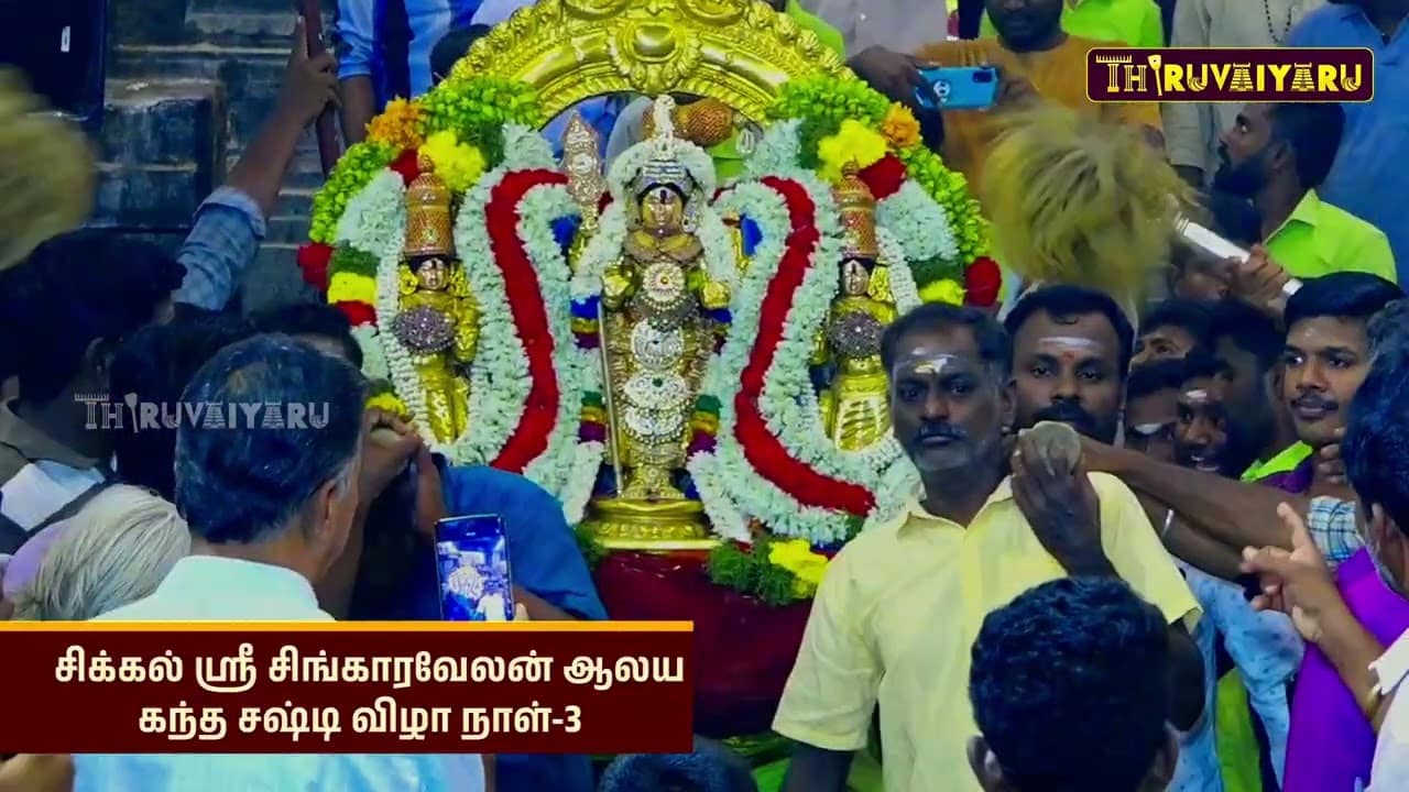 சிக்கல் ஸ்ரீ சிங்காரவேலன் ஆலயத்தில் நடைபெறும் கந்த சஷ்டி விழாவின் மூன்றாம் நாள் சிறப்பு தீபாராதனை. பக்தர்கள் பெருமளவில் கலந்து கொண்டு முருகப்பெருமானின் அருளைப் பெற்றனர்.
