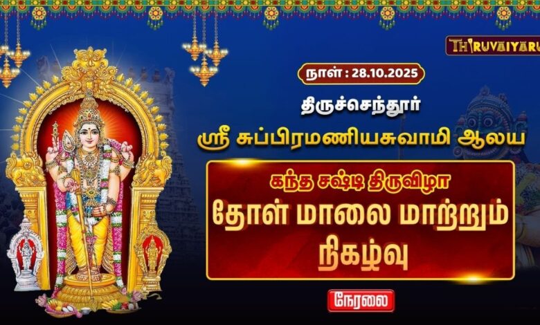 🪔திருச்செந்தூர் ஸ்ரீ சுப்பிரமணியசுவாமி திருக்கோவிலில், மஹா கந்த சஷ்டி திருவிழாவை முன்னிட்டு நடைபெறும் புனிதமான தோள் மாலை மாற்றும் நிகழ்வு இன்று பக்தி பூர்வமாக நடைபெறுகிறது.