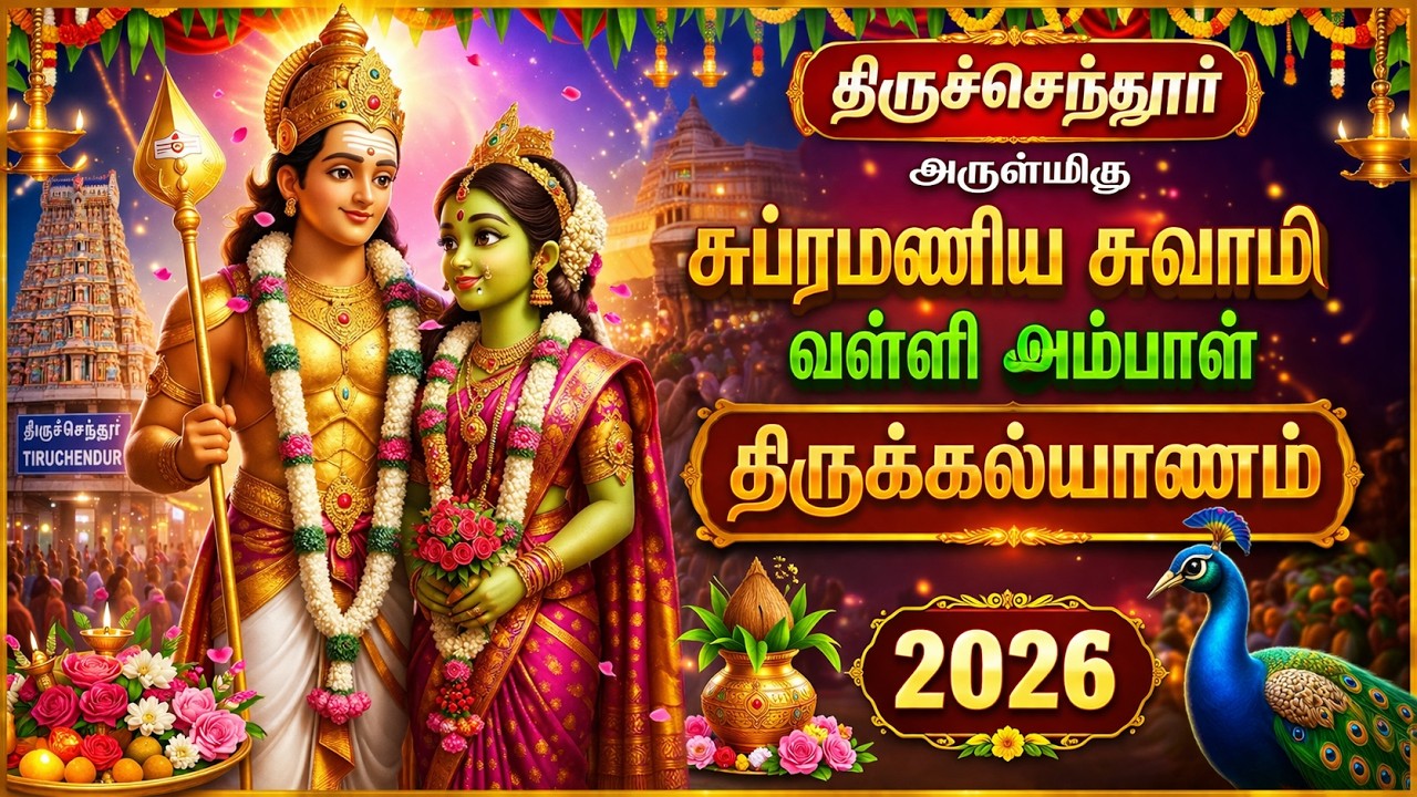 Watch the divine Thirukalyanam (Celestial Wedding) of Lord Subramanya (Murugan) and Valli Amman at the famous Tiruchendur Temple.