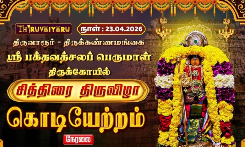 🔴LIVE : திருவாரூர் – திருக்கண்ணமங்கை பக்தவத்சலப் பெருமாள் ஆலய சித்திரை திருவிழா கொடியேற்றம்