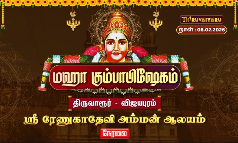✨🙏 திருவாரூர் – விஜயபுரம் ஸ்ரீ ரேணுகாதேவி அம்மன் ஆலய மஹா கும்பாபிஷேகம் – சுவாமி புறப்பாடு புனித நிகழ்வை பக்தர்களுக்காக நேரலையாக (LIVE) ஒளிபரப்புகிறோம்.
