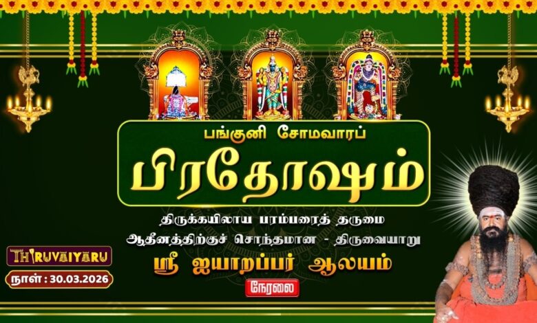 🙏🌺 திருவையாறு ஸ்ரீ ஐயாறப்பர் ஆலயத்தில் நடைபெறும் பங்குனி மாத சோமவார பிரதோஷ தரிசனத்தை நேரலையாக காணுங்கள். இது சிவபெருமானுக்கு மிகவும் முக்கியமான தினமாக கருதப்படுகிறது. பிரதோஷ காலத்தில் தரிசனம் செய்தால் பாபங்கள் நீங்கி, ஐஸ்வர்யம் பெருகும் என்பது நம்பிக்கை. ✨🙏